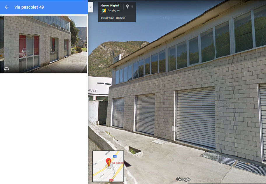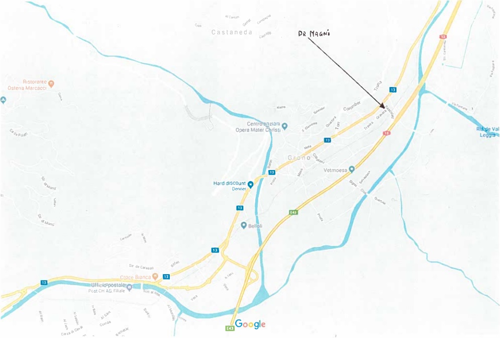 | Per chi viene in automobile percorrendo la A13 si esce a Roveredo e si prosegue verso Grono, dopo avere attraversato la città si prosegue per circa 800 metri fino a che si vede a destra un centro artigianale, vi è una piccola stradina che costeggia il fabbricato prima denominata Via Pascolet 47 e ora via centro sportivo 2, si vede una "fontana di pentole" (foto 1) li si può parcheggiare. L'ambulatorio si trova nel primo angolo della costruzione (foto 2) su google maps si trova cbd360 service che è un negozio contiguo all'ambulatorio. |
